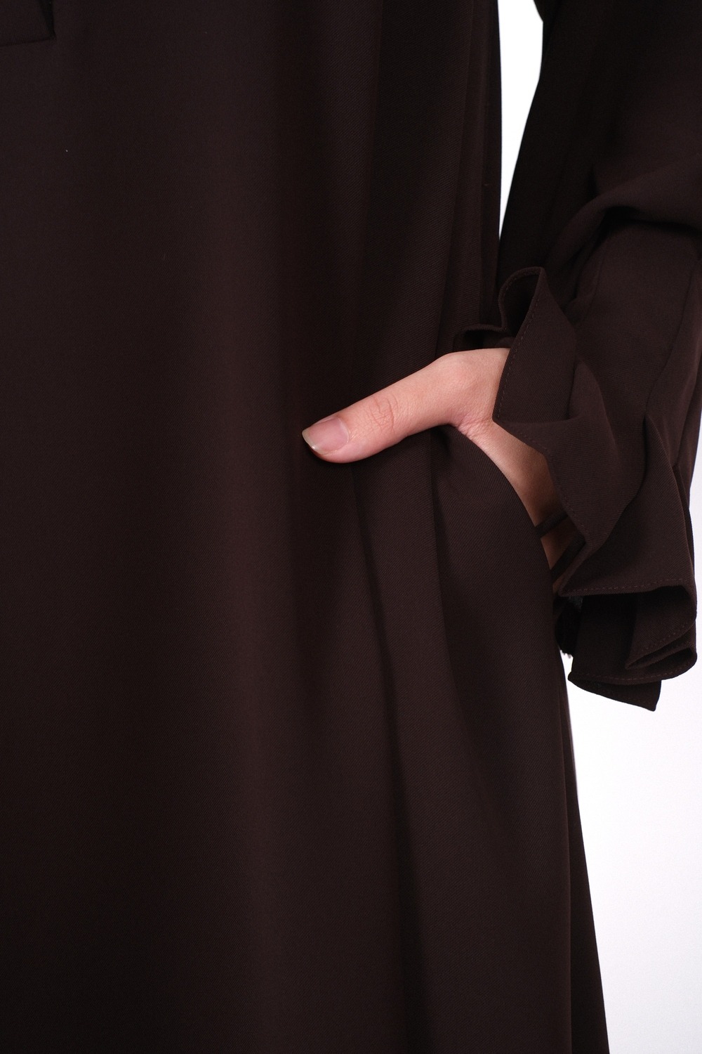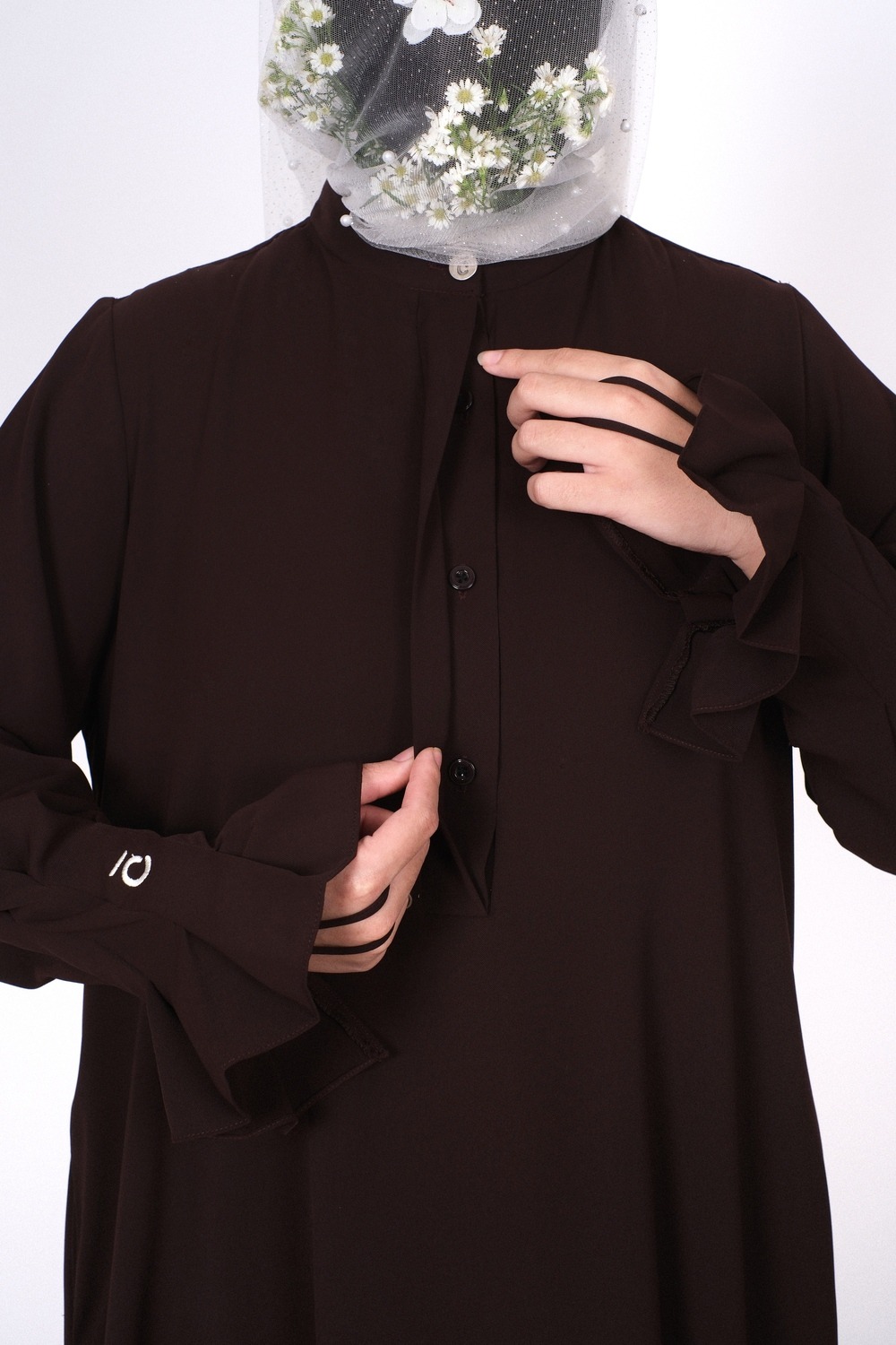 ONLY THE ABAYAAbaya made of premium anti-uv mazen material that is very flowy and not see-through. On the fingers there is a hook strap that is designed so that the abaya remains neat when worn for prayer. There are 4 buttons on the chest that make this abaya breastfeeding friendly.